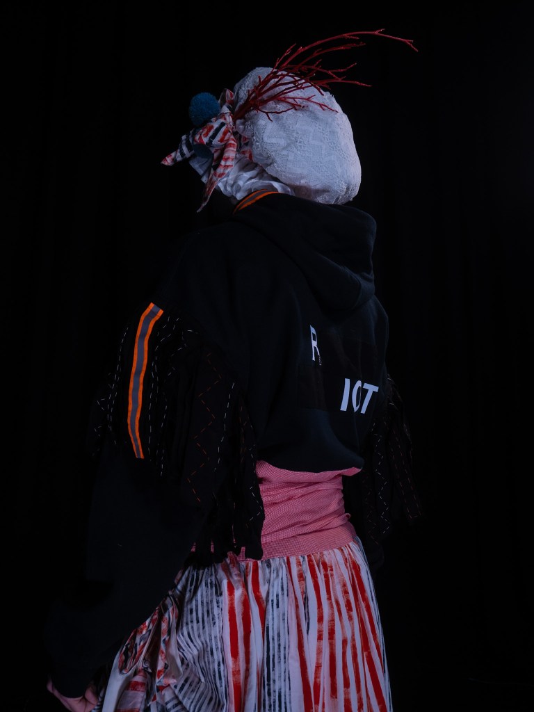 The costumes combine historical references to working women’s clothing of 19th century in Wales with contemporary working apparel. Each costume is machine and hand-stitched and embroidered and has details which refer to textiles in the Carmarthenshire Museums collection in Abergwili. Fabrics and materials are sourced second-hand and made from natural fibres where possible.